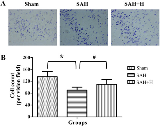 The Nissl staining of the temporal cortex paraffin sections 3 d after SAH. (A) Nissl staining images; (B) The numbers of surviving neurons as determined by microscopy (×400) and cell counting. * p < 0.05 SAH vs. Sham, # p < 0.05 SAH vs. SAH + H.