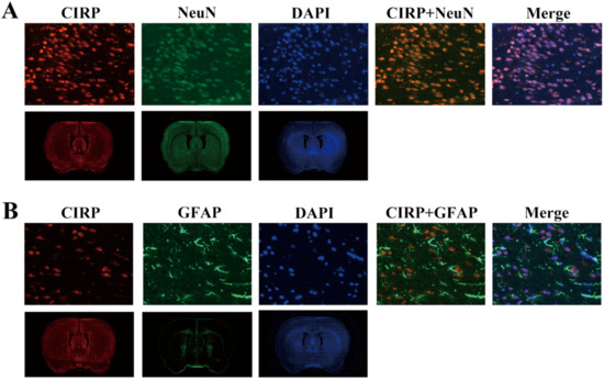 Cold-inducible RNA-binding protein (CIRP) is an RNA binding protein that is extensively expressed in the cerebral cortex [7,8], and is a member of a family of highly conserved cold shock proteins that are continuously expressed at low levels in mammalian cells [9,10,11]. CIRP affects mRNA transcription and translation and facilitates a rapid response to environmental changes at the cellular level. Moreover, CIRP may act as a molecular chaperone to assist in the folding and assembly/disassembly of DNA structures as well as a role in intracellular protein transport [10,12].