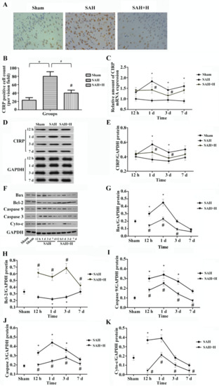 The analysis of CIRP mRNA and protein expression and mitochondrial apoptosis pathway-related proteins from 12 h to 7 d after SAH. (A,B) Immunohistochemical results of rat brain tissue (×400) 1 d after SAH. (C–E) Expression levels of CIRP mRNA and protein at four time points. (C) Analysis of CIRP mRNA at four time points by RT-PCR. (D,E) Western blot analysis of the CIRP protein expression at four time points. (F–K) Expression of the mitochondrial apoptosis pathway-related proteins including Bax, Bcl-2, caspase-9, caspase-3, and cytochrome c. * p < 0.05 SAH vs. Sham; # p < 0.05 SAH+H vs. SAH.