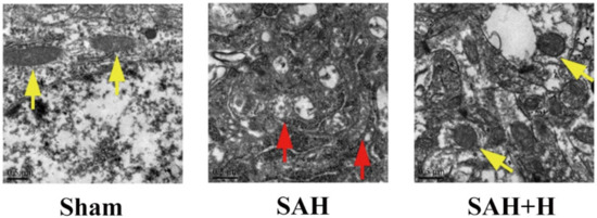 The transmission electron micrographs of neuronal mitochondria 1 d after SAH. Yellow arrows show normal mitochondrial morphology; red arrows point to abnormal mitochondrial morphology.
