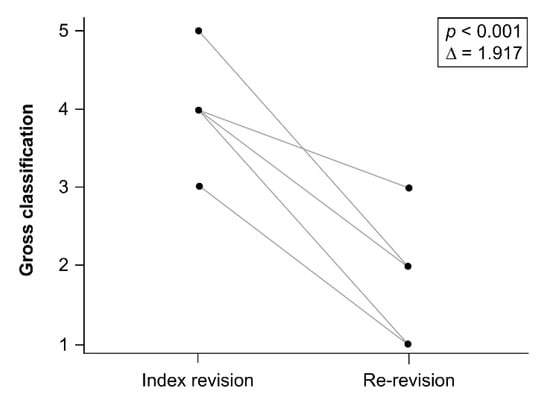 Acetabulum bone loss significantly decreased between index revision and re-revision according to Gross classification (p < 0.001).