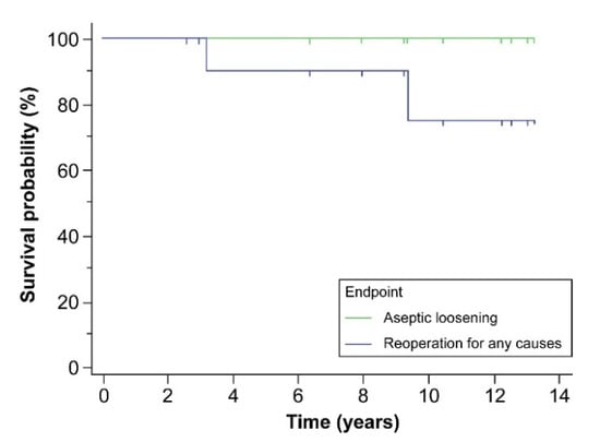 The Kaplan–Meier survivorship was 100% with aseptic loosening as the endpoint, and 90% and 75% at five- and ten years, respectively, with reoperation for any reason as the endpoint.