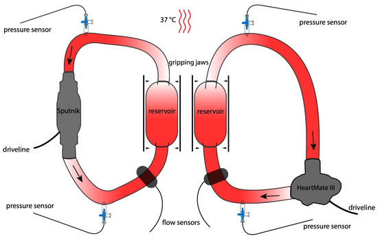 Blood flow was measured via flow sensors (BioProTTTM Clamp-OnTM Transducer, em-tec GmbH, Finning, Germany) connected to the PVC tubing. Pressure sensors (Pressure Probe Xtrans, CODAN pvb Critical Care Inc., Forstinning, Germany) were connected before and behind the LVADs via Luer connectors for continuous pressure monitoring within the systems.