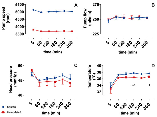 The temperature (Figure 3D) strongly increased over the first hour in both groups. This occurred due to the initial heating of the blood inside the heating hood. Comparing both groups, the temperature was significantly higher in the Sputnik group after 60 min. This significant difference could be explained by the stronger self-heating of the Sputnik pump due to higher pump speed and heat generation in its mechanical bearings [3].