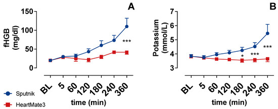 The concentration of fHGB (Figure 4A) and potassium (Figure 4B) increased gradually during circulation in the Sputnik group. Potassium was statistically significantly higher after 180 min, whereas fHGB was statistically significantly higher after 360 min in the Sputnik group compared to the HeartMate 3 group. As fHGB and Potassium are indicators of hemolysis, these results seem to indicate increased hemolysis in the Sputnik group toward the end of the experiments in comparison to the HeartMate 3 group.