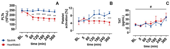 (A) Platelets (PLTs), (B) platelet activation, and (C) thrombin/antithrombin complex (TAT) over time. Baseline (BL). * p < 0.05; ** p < 0.01; *** p < 0.001; # p < 0.05.
