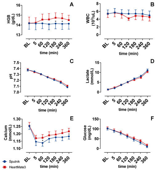 (A) Total hemoglobin (HGB), (B) white blood cell count, (C) pH value and (D) lactate concentration, (E) calcium concentration and (F) glucose concentration over time. Baseline (BL). * p < 0.05.