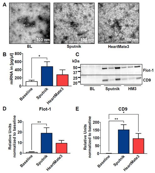 (A) Representative TEM images of EVs isolated by precipitation from the baseline in both Sputnik and HeartMate 3 test loops after 6 h. (B) MiRNA was isolated from EVs and quantified using a eukaryotic total RNA Pico chip. (C) Representative Western blot images of common EV markers in EVs isolated at baseline and after 6 h of circulation using the Sputnik and HeartMate 3 pumps. (D,E) Western blot bands were quantified and normalized to the corresponding total protein amount visualized in the acrylamide gels by stain-free technology and then compared to baseline. Data represent means ± SEM of six independent samples. Significance: * p < 0.05; ** p < 0.01.