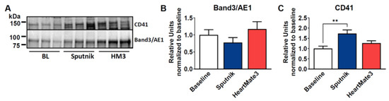 Since all blood cells can secrete EVs, we wanted to identify the origin of our isolated EVs. Therefore, we probed the membrane for band 3 anion transport protein, also known as anion exchanger 1 (AE1), which is found in the erythrocyte membrane. As a marker of platelets, we used CD41, which plays a crucial role in coagulation (Figure 8). For Band 3/AE1, no significant differences were detected between baseline and Sputnik or HeartMate 3 EVs, which indicates that erythrocytes are not the parental cells. However, we could detect a statistically significant increase in CD41 in the Sputnik EVs and, to a lesser (not statistically significant) extent, in the HeartMate 3 EVs.