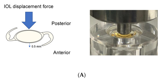 - Mochiji, M.; Kaidzu, S.; Ishiba, Y.; Matsuda, Y.; Tanito, M. Measurement of Force Required for Anterior Displacement of Intraocular Lenses and Its Defining Parameters. Materials 2020, 13, 4593. [Google Scholar] [CrossRef] [PubMed]