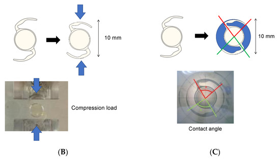 Biomechanical measurements of the intraocular lens (IOL). (A) IOL displacement was determined as the force required to move an IOL 0.5 mm forwards. (B) Compression load was defined as the force required to decrease the total length of the IOL to 10 mm. (C) Contact angle was the total angle of the area where the two haptics were in contact with the wall of the 10 mm diameter holder.