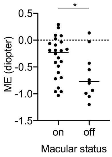 A significant correlation was found only between macular status and ME, and the type of IOL was not significantly correlated with ME (Table 5). Macula-off RRD resulted in a significant myopic error compared with macula-on RRD (Figure 3).