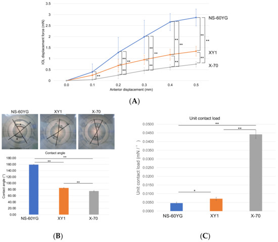 The biomechanical characteristics of the intraocular lenses (IOLs) NS-60YG, XY1, and X-70. (A) The IOL displacement force at each 0.1 mm of anterior displacement up to 0.5 mm. Repeated measures two-way analysis of variance was performed. ** p < 0.01 (B) The comparison of contact angle of the intraocular lenses (IOL). (C) Unit contact load (compression load/contact angle). * p < 0.05, ** p < 0.01. Blue line and bars, NS-60YG; Orange line and bars, XY1; Grey line and bars, X-70.