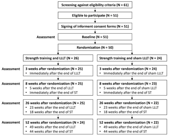 Study flowchart. Abbreviations: LLLT: low-level laser therapy; ST: strength training.