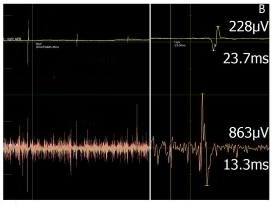 For recording the responses from the cricothyroid muscle, two hook wire electrodes (type 003-400160-6) (SGM d.o.o., Split, Croatia) were inserted into the cricothyroid muscle according to published methodology [,]. Surface electromyography electrodes (Ambu Blue Sensor BR, BR-50-K/12) were attached in a belly tendon fashion over the right APB muscle with the ground electrode over the dorsal surface of the APB muscle. Before insertion of the electrodes individually, the subject needs to slightly extend the neck and produce a high-pitch sound (i.e., /iiii…/). During this slight facilitation, it is helpful to palpate the contracted cricothyroid muscle belly between the thyroid and cricoid cartilages by marking this spot with the marker. Each hook wire electrode consists of Teflon-coated stainless steel wire 76 µm in diameter, passing through 27-gauge needles (0.4 mm), 13 mm in length. The recording wires have a stripped Teflon isolation of 2 mm at their tip and are curved to form the hook for anchoring them. The sampling rate was 3 kHz per channel, resolution 0.3 µV, scale −7.5–7.5 mV, CMRR > 90 dB, noise < 5 µV peak-to-peak, and frequency band 10–500 Hz. The RMT intensity for the upper extremity muscles (abductor pollicis brevis) was 49% of maximal stimulator output. Figure 1 (A)(B) presents positive cortical spots for primary motor cortical representation for upper extremity APB muscle and cricothyroid muscle with the recording of MEPs from APB and cricothyroid muscle. The single magnetic pulse intensity over the LMC was gradually increased from 51% to 80 % of maximal stimulator output that the subject could tolerate (reporting pain and discomfort due to activation of temporal musculature). Figure 2 shows application of a single magnetic pulse during vocalization, inducing motor evoked potential from the left cricothyroid muscle (latency of 11.3 ms) with no cSP induced in the cricothyroid muscle at 80 % of maximal stimulator output.