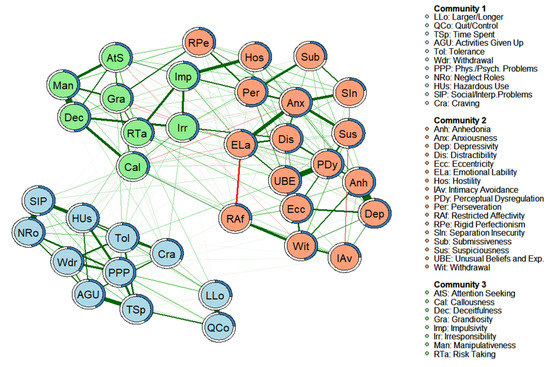 Thus, the present study aimed to (1) examine the relationships between personality facets and AUD criteria according to their organization into different substructures in the network, as well as to test for invariance according to gender by comparing the structure, global strength, and edges between the networks of men and women; and (2) identify the bridge nodes between the different substructures identified, which could help to explain the comorbidity between PD and AUD.
