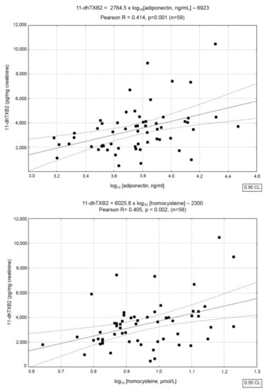 Parameters and analytes that correlated with 11-dehydro-TXB2 at the significance level p < 0.10 were included in multiple linear regression analyses. Concentrations of variables with log-normal distribution (i.e., hs-CRP, homocysteine, and adiponectin) were log-transformed before the calculations. The final results of the statistical analysis are shown in Table 5—homocysteine, adiponectin, and hs-CRP were found to be statistically significant predictors of 11-dehydro-TXB2 levels, with the explanatory power of the model given by Multiple R = 0.60 and R2 = 0.36. All tested models are presented in Supplementary Table S1.