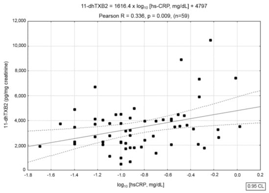 Statistical analyses were performed with Statistica for Windows, Version 12 (StatSoft, Inc., Tulsa, OK, USA). The data normality was checked with visual inspection and the Kolmogorov–Smirnov test. Data were expressed as means and standard deviations or medians with ranges. The Mann–Whitney U test was used to assess the differences between subgroups of patients for variables with non-Gaussian distributions. Otherwise, the Student’s t-test was used. In addition, logarithmic transformation was applied to the positively skewed data. Spearman or Pearson correlation coefficients were calculated for selected variables. Multiple linear regression was used to assess the factors independently associated with 11-dehydro-TXB2 levels. A two-sided p-value < 0.05 was considered significant.