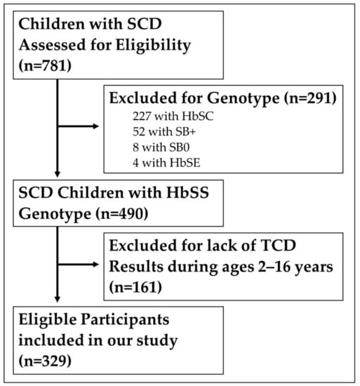 Selection of patients: We included all patients previously diagnosed with hemoglobin SS disease (HbSS) seen at the Comprehensive Sickle Cell Clinic at the Children’s Hospital of Michigan (CHM) who had at least one TCD. The ages at the time of data extraction (14 July 2020) ranged from 2 to 25 years, although all TCDs were performed when those patients were between the ages 2 and 16.