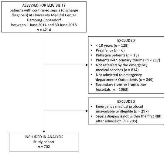 We identified 4214 in-patients with confirmed sepsis, who were treated at the University Medical Center Hamburg-Eppendorf between 1 June 2014 and 30 June 2018. In total, 702 patients fulfilled all eligibility criteria and were included in the analysis (Figure 1). Prehospital emergency medical care was provided by EMS without physicians in 64.2% (451/702) or by EMS with emergency physicians in 35.8% (251/702) of the cases (Table 1).