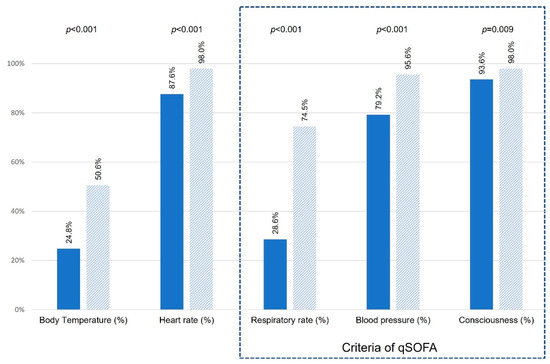 Overall, the prehospital assessment of sepsis indicators and qSOFA parameters was poor, particularly regarding suspected infections, body temperature and respiratory rate. EMS without emergency physicians less frequently provided complete recordings of all five focused vital parameters compared with EMS with emergency physicians (8.6% versus 38.6%, p < 0.001) (Figure 2).