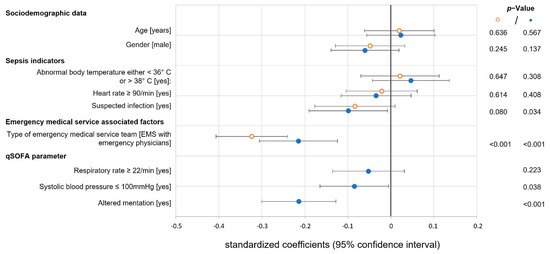 Time to fluid resuscitation. The forest plot shows the standardized coefficients with 95% CI (x-axis) and p-values for each covariable regarding the secondary endpoint ‘time to fluid resuscitation’ of two multiple linear regression models (n = 702 cases): model without qSOFA (orange ᵒ dot) and model with additional qSOFA parameters (blue • dot); time is logarithmized; the vertical solid line marks a standard coefficient of zero, a shift to the right indicates a prolonged and to the left side a shortened ‘time to fluid resuscitation’; qSOFA: quick sequential organ failure assessment.