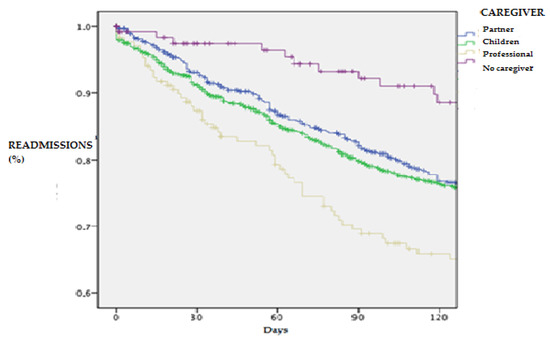 Survival analysis for readmissions in patients with HF according to caregiver type at 120-day follow-up.