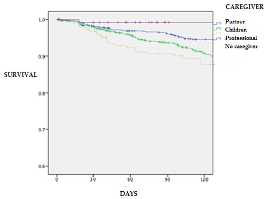 Figure 1 and Figure 2 show the tendency to present fewer admission and death events in these types of caregivers, with log-rank scores of 11.2 with p = 0.010 and 10.8 with p = 0.013.4