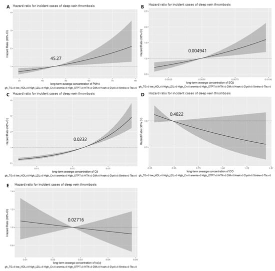 A Cox proportional hazards model with spline terms for adjusting factors was used. The relationship between the long-term average concentration of each air pollutant and the incidence of VTE was plotted in Figure 1.