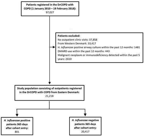 Study flow chart illustrating the patient selection criteria. After exclusion, the study population consisted of 21,218 patients, of which 801 acquired H. Influenzae during follow-up of 365 days. Abbreviations: Danish Register of Chronic Obstructive Pulmonary Disease (DrCOPD), disease-modifying anti-rheumatic drugs (DMARD), Haemophilus influenzae (H. Influenzae).