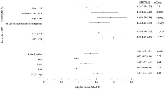 Forest plot of variables used in Cox proportional hazard regression model showing adjusted hazard ratios with their respective 95% confidence intervals. The variables include: accumulated ICS dose (low < 120 mg, moderate 120–300 mg, high > 300 mg; reference group; no ICS use), accumulated OCS dose (low ≤ 750 mg; high >750 mg; reference group; no OCS use), active smoking (reference group: non-active smoking), age (per group increase), sex (male; all female patients are included in analysis despite male sex being mentioned), BMI (body mass index; per group increase), and Global Initiative for Chronic Obstructive Lung Disease (GOLD) stage (per group increase).