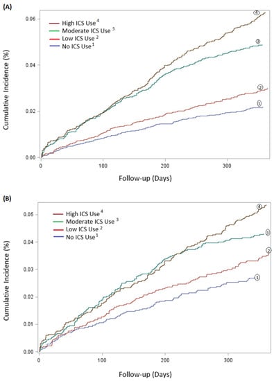 Cumulative incidence, in percentage (%), of H. Influenzae during first 365 follow-up days after cohort entry, categorised according to different accumulated doses of ICS. (A) Cumulative incidence of 21,218 patients, categorised in the following four ICS groups: no ICS use, low ICS dose, moderate ICS dose and high ICS dose. (B) Cumulative incidence of 13,324 matched patients, categorized similarly as above.