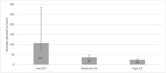 Number needed to harm for low, moderate, and high ICS use. ICS exposure was calculated by the accumulated dose of ICS prescriptions reimbursed within 365 days prior to study entry. The accumulated dose was divided into tertiles of low, moderate, and high ICS dose, with non-users as the reference group. The NNH for the three groups: Low ICS (NNH 107, 95% CI 66.1–284.7), Moderate ICS (NNH 36 95% CI 28.8–48.4), and High ICS (NNH 24, 95% CI 20.3–29.4). * There was not a significant increased risk of acquiring a positive H. Influenzae sample for the Low ICS group in the main analysis.