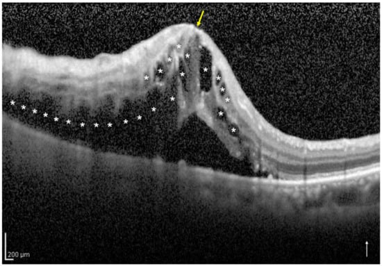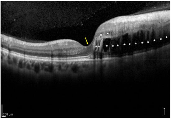 A vertical optical coherence tomography (OCT) image of the right eye with intraretinal fluid (IRF) not involving the central foveola secondary to branch retinal vein occlusion of a 54-year-old woman. The OCT shows IRF (asterisks) not involving the central foveola (yellow arrow). The white arrow indicates the OCT scan direction. This eye was classified into the one-side IRF group.