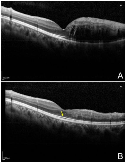 Based on the vertical OCT B-scan image through the fovea at 12 months after the initial treatment, one observer (H.S.) evaluated the foveal EZ band continuity (Figure 3 and Figure 4) and was masked to the BCVA at the 12 months; a senior observer (M.Z.), who was also blinded to the patient data, made the final decision concerning the ambiguous cases.