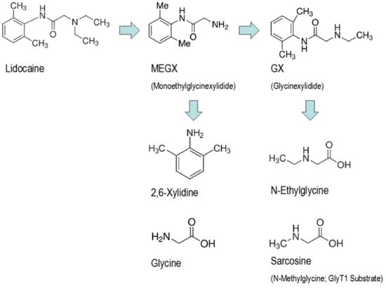 The MEGX concentration has been used to evaluate liver function after lidocaine administration []. In terms of its anti-convulsant and anti-arrhythmic properties, MEGX has around 80% potency compared to that of lidocaine []; it also decreases the clearance of lidocaine []. Conversely, GX has much less activity and is metabolised and excreted by the kidney. MEGX and GX can cause toxicity in patients with cardiac failure and renal failure, respectively [].