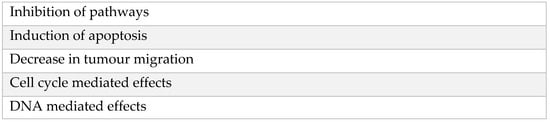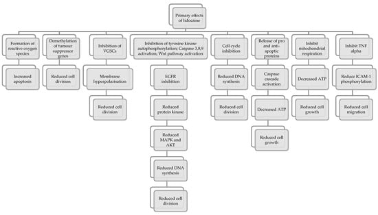 To summarise, numerous mechanisms have been proposed in the research of how local anaesthetics such as lidocaine are thought to reduce cancer recurrence []. Such mechanisms include but are not limited to (Figure 2):