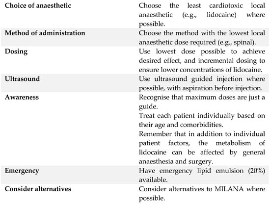 The exact doses or concentrations at which toxicity manifests are difficult to predict in patients; thus, careful continuous monitoring is required. Intravenous lidocaine is also contraindicated if other local anaesthetic interventions are used concurrently, for example, in various neuraxial blocks. The exact timing of when it can be used remains unclear. Foo et al. [] recommended lidocaine not to be used specifically within four hours of interventions. However, some authors believe this four-hour rule to be problematic []. It is easy to assume a straightforward additive effect when multiple local anaesthetics are combined. However, it is likely more complex, because each patient has a slightly different physiology, and different anatomical structures may have different anaesthetic requirements, alongside different pharmacokinetic variables. As clinicians, there is the tendency to assume multiple interventions automatically translate to additional benefits; however, this may in fact increase the risk of harm to patients. Therefore, multiple interventions of local anaesthetics (MILANA) should be avoided in susceptible populations []. Some strategies to minimise local anaesthetic systemic toxicity (LAST) are shown in Figure 5: