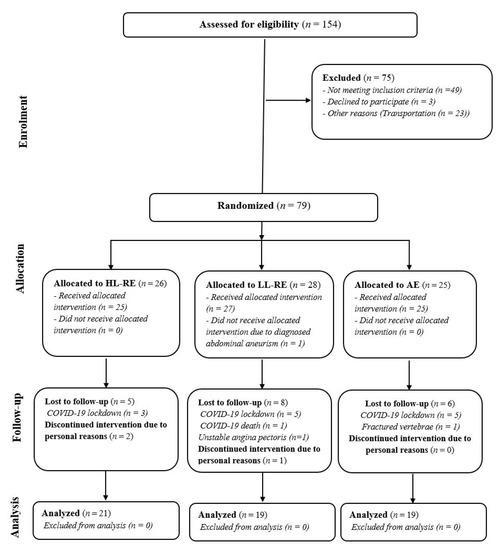 CONSORT study flow. HL-RE: high-load resistance exercise; LL-RE: low-load resistance exercise; AE: aerobic exercise; COVID-19: coronavirus disease-19.