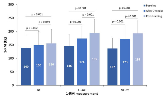 The training intervention had a significant time effect (p < 0.001) and a time x interaction effect (p < 0.001) on 1-RM. Compared with baseline, all training groups significantly improved 1-RM after seven weeks and post-training (Figure 2). Improvement in 1-RM was significantly greater than in the HL-RE than in the LL-RE (+7%, p = 0.012) and AE groups (+20%, p < 0.001) after 7 weeks. In addition, 1-RM was also improved to a greater extent in the LL-RE group compared with the AE group (+13%, p < 0.001) after seven weeks. Following the training intervention, there was a significantly greater improvement in 1-RM in the HL-RE (+31%, p < 0.001) and LL-RE (+23%, p < 0.001) groups compared with the AE group.