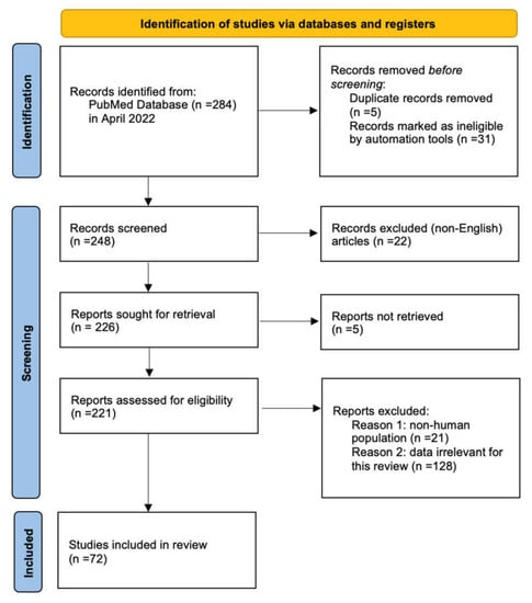 A comprehensive search was conducted last in April 2022 in PubMed online electronic database using the key phrases (“immunoglobulin” OR “IVIG”) AND “aseptic meningitis”. No timeframe restrictions were assigned for the selected publications. The articles were selected following the PRISMA guidelines. A total of 284 articles were found. Before the initial screening, five articles were found to have duplicates, therefore they were removed. Additionally, 31 papers were unable to be screened (i.e., no abstract available). A total of 248 publications were screened and 22 non-English articles were excluded. Five articles were unable to be retrieved. Out to the 221 reports, which were assessed for eligibility, 21 were rejected as they involved non-human subjects. A total of 128 articles were identified after thorough analysis as irrelevant to the review. Finally, a total of 72 papers were analyzed in this article. All authors conducted the search separately in order to provide the most accurate results and avoid the risk of bias. In Figure 1, we present the schematic diagram of the selection process of articles chosen for this review.