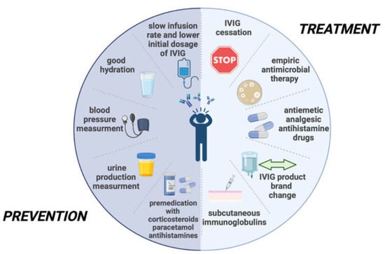 Treatment and preventative measures of IVIG-induced aseptic meningitis [,,,,,,,,,,]. This figure was created with BioRender.com (https://biorender.com/ (accessed on 12 May 2022).