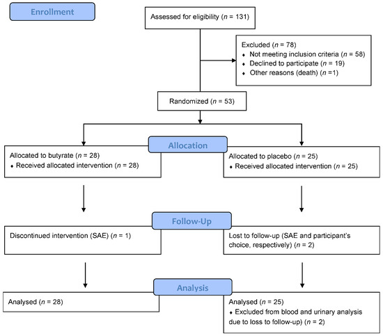 A total of 131 persons consented to participate. Twelve dropped out before the calprotectin home test or were excluded after performing two invalid tests. Of the 119 persons who performed the calprotectin test correct at home, 56 (47%) had <50 μg/g, 48 (40%) had 50–200 μg/g and 15 (13%) had >200 μg/g calprotectin. The two latter groups were invited for randomization, and all 53 persons were randomized (28 butyrate, 25 placebo). One participant terminated the intervention after a serious adverse event (SAE) (ischemic stroke), and seven other participants were non-adherent. Two participants dropped out after week eight, and fecal samples from week eight were used as EOS samples for these two persons in the main analysis of the fecal endpoints, whereas they were not included in analyses of the other endpoints. A flow diagram is presented in Figure 1. Baseline characteristics are displayed in Table 1. Among the 53 individuals, 23 (43%) were women, mean ± SD age was 54 ± 13 years and diabetes duration was 30 ± 15 years. At baseline, median [Q1:Q3] UACR was 46 [14:21] mg/g with 21 (40%), 24 (45%) and 8 (15%) participants having normo-, micro- and macroalbuminuria, respectively. Clinical characteristics at baseline were balanced between the butyrate and placebo group, apart from current smokers, who were all in the placebo group, and treatment with metformin and statin was more frequent in the butyrate group. We found no cases of subclinical celiac disease or IBD at baseline. Only 29 (55%) of the participants had elevated fecal calprotectin (≥50 μg/g) at baseline, despite a positive calprotectin test at home. When all four fecal calprotectin measurements during the study were taken into consideration, 42 (79%) participants had fecal calprotectin value ≥ 50 μg/g at minimum one timepoint during the study period.