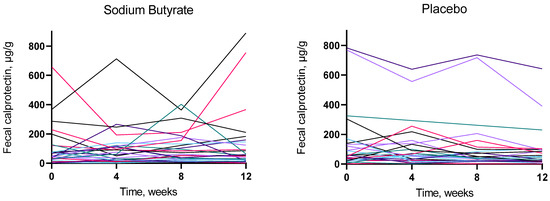 Figure 2. Effects of 12 weeks of treatment with sodium butyrate or placebo on fecal calprotectin. Each colored line represents one participant.