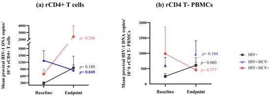Evolution of HIV viral splicing in (a) rCD4+ T cells and (b) rCD4 T- PBMCs. Footnote: The study groups were: (1) HIV+: PLWH; (2) HIV+/HCV-: PLWH and HCV, who spontaneously cleared HCV infection; and (3) HIV+/HCV+: PLWH and HCV, who were never treated for HCV at baseline but achieved a sustained viral response with direct-acting antivirals at endpoint. Symbols with connecting lines represent reservoir-size arithmetic mean and standard error of the mean. Differences between baseline and endpoint for the different study groups were calculated using a mixed-model Gamma-distributed GLM. Statistical significance was defined as p < 0.05 (2-tailed). HIV, human immunodeficiency virus; HCV, hepatitis C virus; rCD4+ T cells, resting CD4+ T cells; rCD4 T- PBMCs, resting CD4 T cells-depleted PBMCs; baseline, time of the study when HIV+/HCV+ individuals had never been treated for hepatitis; endpoint, time of the study when HIV+/HCV+ subjects had cleared HCV by treatment with direct-acting antivirals.