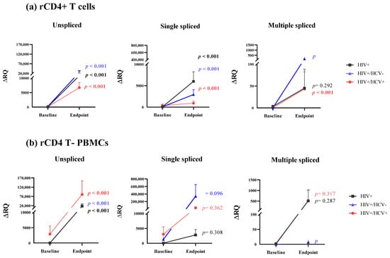 Changes in the expression of HIV viral-splicing transcripts in rCD4+ T cells were determined for the paired samples from the three study groups. The analysis of unspliced transcripts showed a significant increase in expression (p < 0.001) in all study groups (HIV+ group: mean 78.38 ± 23.99 ΔRQ at baseline vs. 19,642.97 ± 12,755.41 ΔRQ at endpoint; HIV+/HCV- group: 243.19 ± 98.75 ΔRQ vs. 25,931.78 ± 9188.52 ΔRQ; HIV+/HCV+ group: mean 67.93 ± 22.47 ΔRQ vs. 6720.26 ± 1730.39 ΔRQ) (Figure 2a). The analysis of single-spliced transcripts also showed a significant increase in the mean expression in all study groups (p < 0.001) (HIV+: 61.84 ± 57.51 ΔRQ vs. 6017.93 ± 2263.02 ΔRQ; HIV+/HCV-: 60.49 ± 31.17 ΔRQ vs. 2937.77 ± 1164.09 ΔRQ; HIV+/HCV+: 390.25 ± 285.76 ΔRQ vs. 915.50 ± 508.29 ΔRQ). However, in the analysis performed in multiple-spliced transcripts, only coinfected subjects showed a significant increase in the mean expression (p < 0.001) (0.05 ± 0.04 ΔRQ vs. 43.80 ± 39.3 ΔRQ), in contrast with the spontaneous clarifiers (0 ± 0 ΔRQ vs. 159.02 ± 58.98 ΔRQ; (p = 0.262)) and HIV-monoinfected individuals (3.06 ± 0.02 ΔRQ vs. 45.29 ± 3.01 ΔRQ; (p = 0.292)).