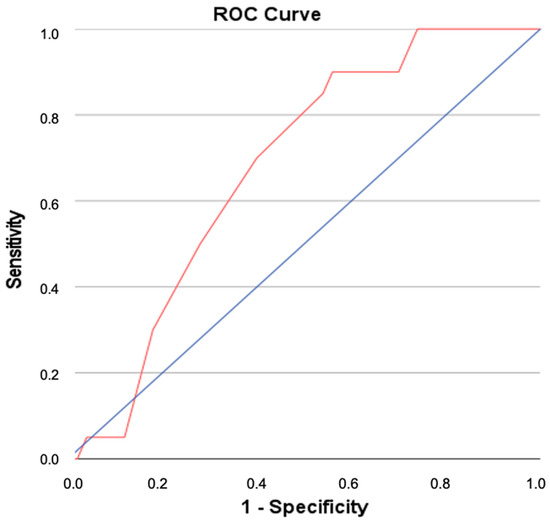 A t-test revealed significant correlation between the initial LRINEC and the patient outcome. There were significantly higher LRINEC values for patients with exitus letalis than for those with positive disease progression (p = 0.006). Furthermore, we built receiver operating characteristic (ROC) curves to determine an appropriate cut-off value for the initial LRINEC score regarding lethality (Figure 3). The area under the ROC curve was 0.677 (p-value = 0.021). Thus, the area under the curve (AUC) was significantly greater than 0.5 and the initial LRINEC (AD-0) can be considered a significant predictor of lethality. In the context of our studies, a cut-off value of greater than 6.5 (i.e., 7, because LRINEC score is an integer) resulted in an optimal constellation of sensitivity (70%) and specificity (60%), with a positive predictive value of 41.2% and a negative predictive value of 83.3%.