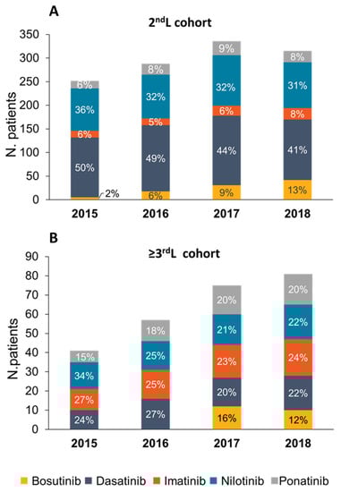 Distribution of patients by TKI in each calendar year in the 2nd L (A) and ≥3rd L (B).