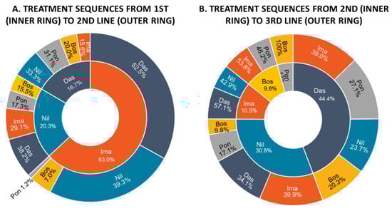 Treatment sequences from 1st (inner ring) to 2nd line (outer ring) (A) and from 2nd (inner ring) to 3rd line (outer ring) (B) considering all patients included in the analysis. Abbreviations: Bos, bosutinib; Das, dasatinib; Ima, imatinib; Nil, nilotinib; Pon, ponatinib.