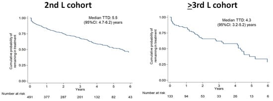 After a median follow-up of 3.0 and 2.6 years, the proportion of deceased patients was 13.2% and 19.4% in 2nd L and ≥3rd L cohorts, respectively (Table 3). Around 40% in both the cohorts, discontinued their treatment, with a median time to discontinuation of 5.5 (95%CI: 4.7–6.2) years in the 2nd L cohort and 4.3 (95%CI: 3.2–5.2) years in the ≥3rd L cohort (Figure 3).